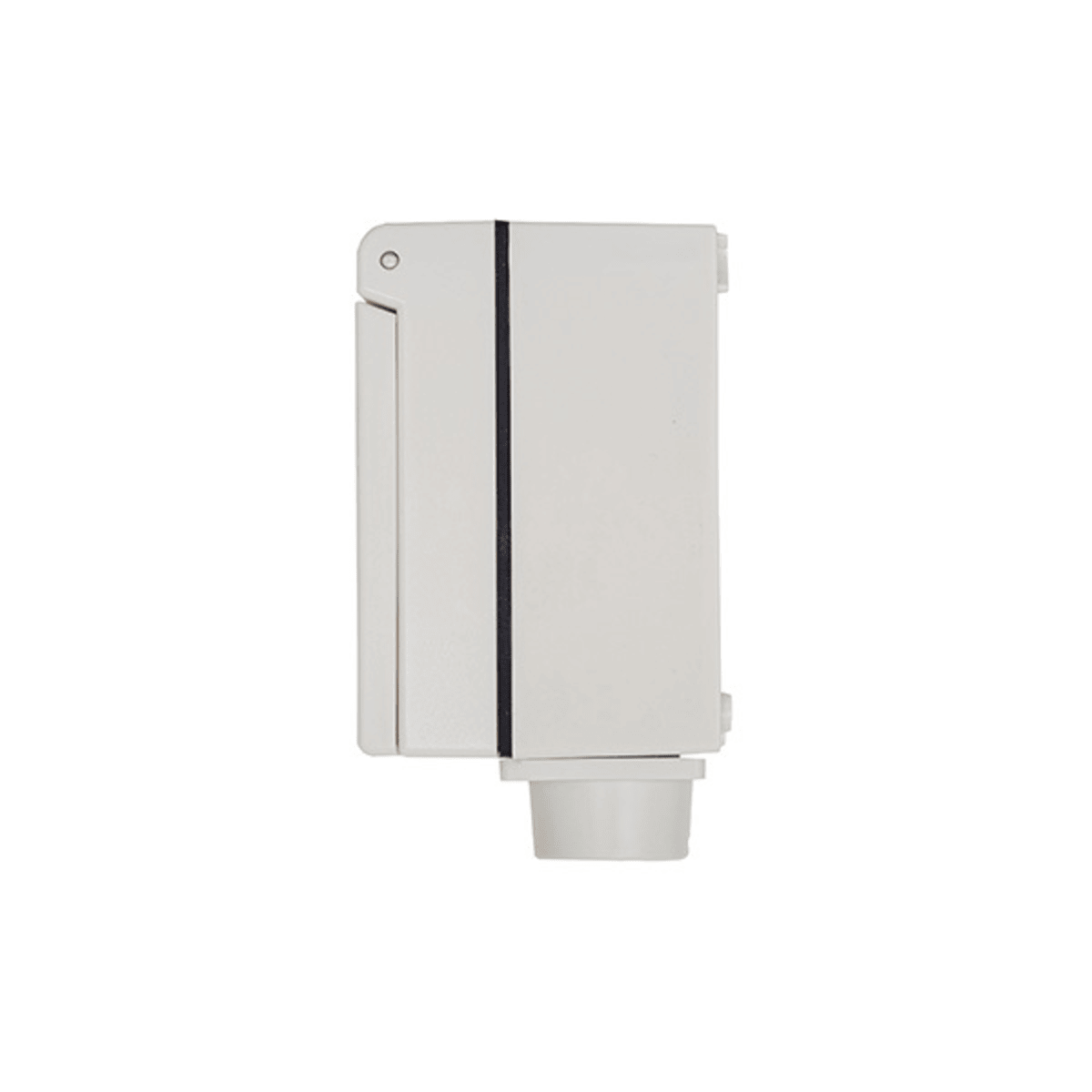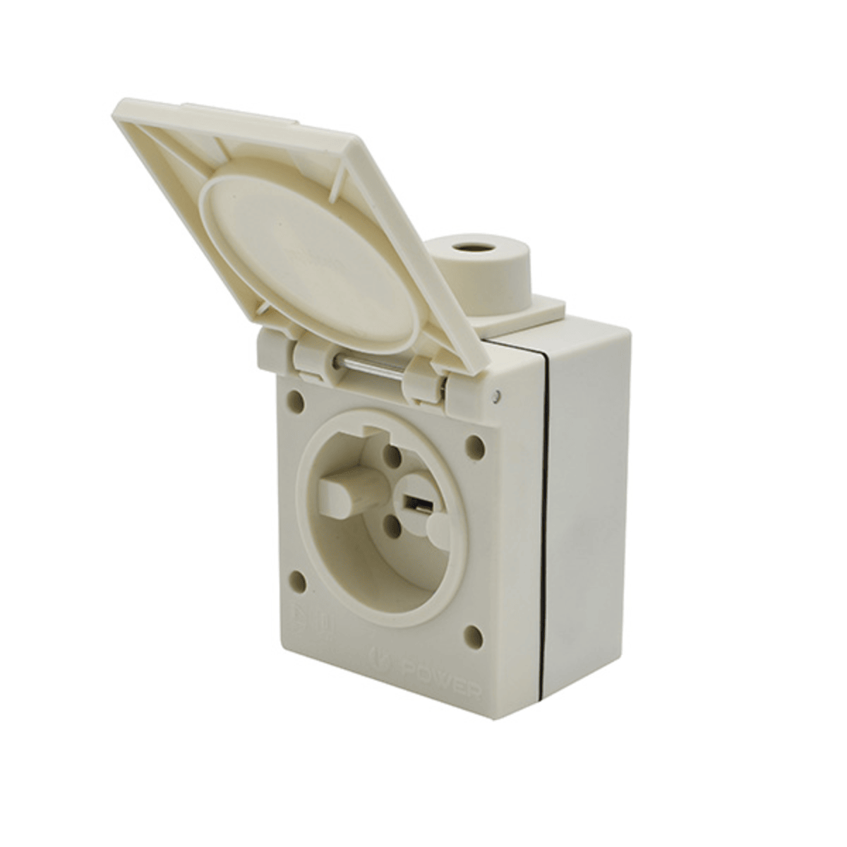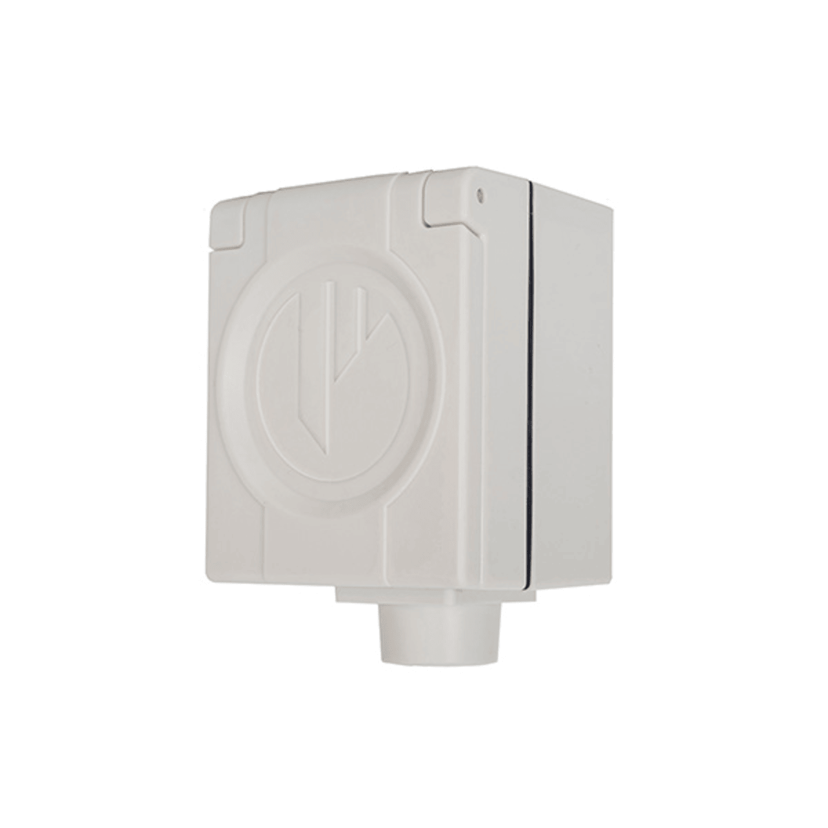 Utanpåliggande kapslat Perilexuttag, IP44. Med självstängande klafflock. Levereras med en strypnippel. Vändbart vilket möjliggör kabelingång uppifrån eller underifrån.
