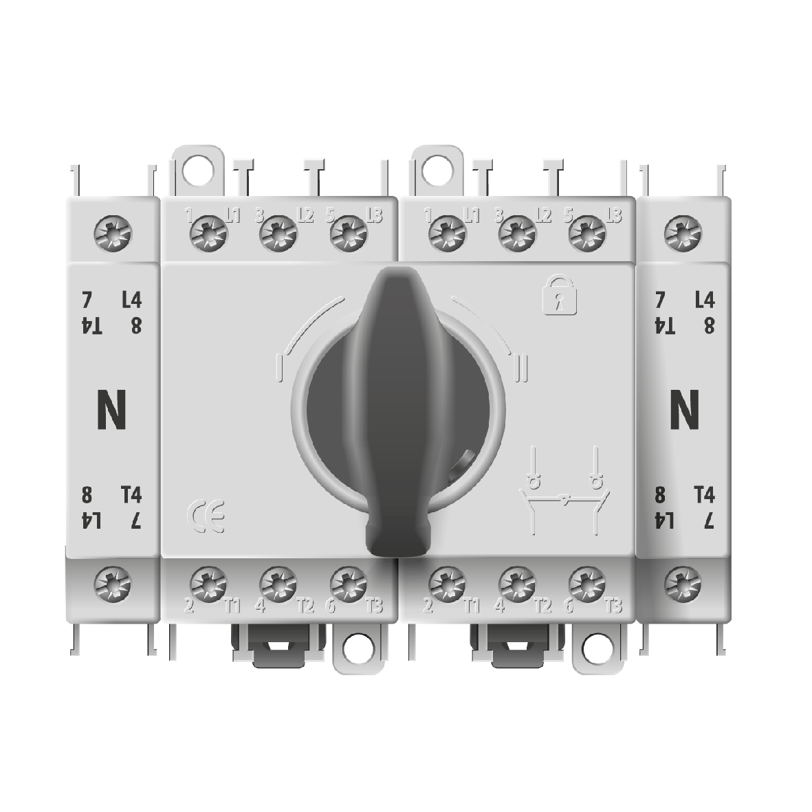 Nät-/reservkraftomkopplare 4-polig 63A för inbyggnation i kapsling. Anslutningar för max 10mm2
