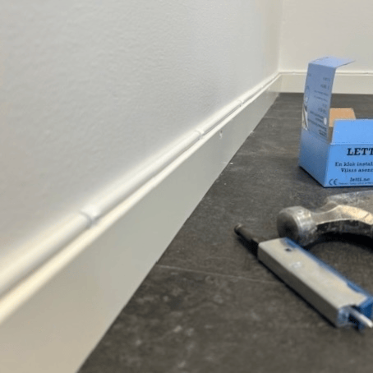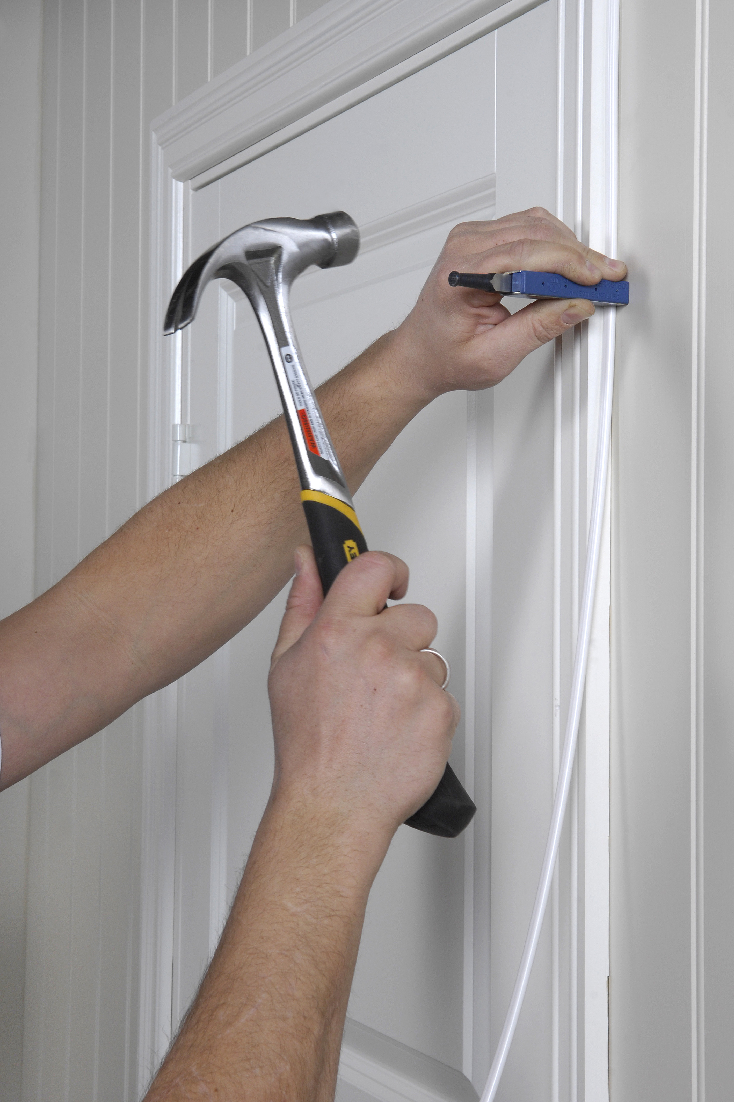 Placera ett Lettiklammer i verktyget. Med hjälp av verktyget styrs kabeln på plats. Slå därefter ett par slag med hammare för att fästa klammern i underlaget. Se video nedan för demonstration.