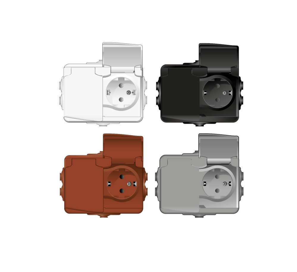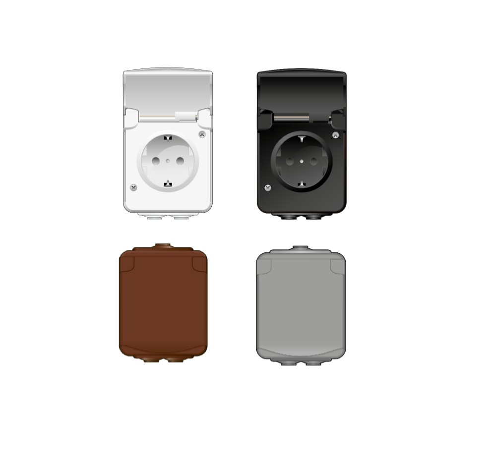 Vi levererar IP44-klassade vägguttag. Uttaget har petskydd och locket är självstängande. Samtliga delar består av halogenfri termoplast. Anslut kablar via skruvanslutning. Ett kvalitetsuttag som finns både som 1-vägsuttag och 2-vägsuttag.